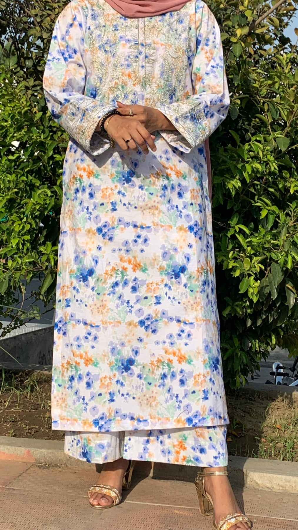 Aurah Bloom captures the essence of summer with its dreamy floral print and delicate embroidery. This 2-piece lawn suit blends soft pastel tones with intricate neckline detailing, offering a breezy, elegant look for sunny days and casual gatherings.