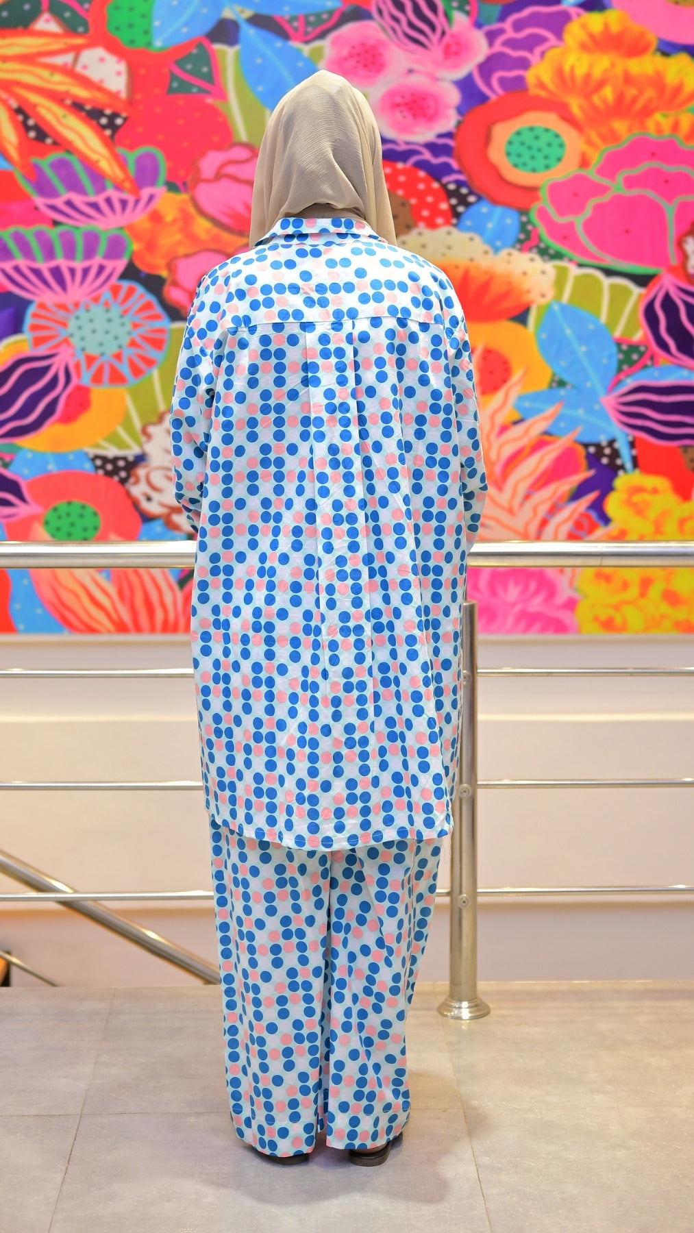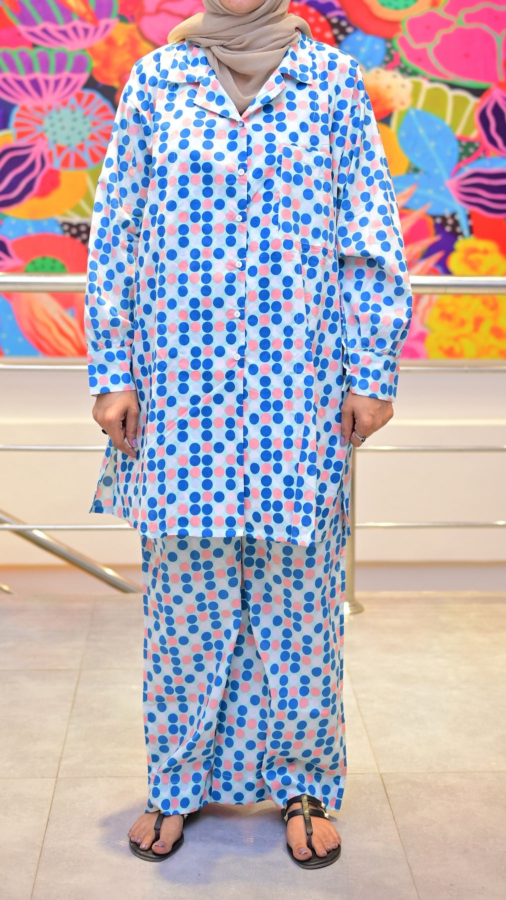 A playful blue & pink polka dot 2-piece dress with a laid-back cut. Ideal for casual days, cozy errands, or lounging in style.