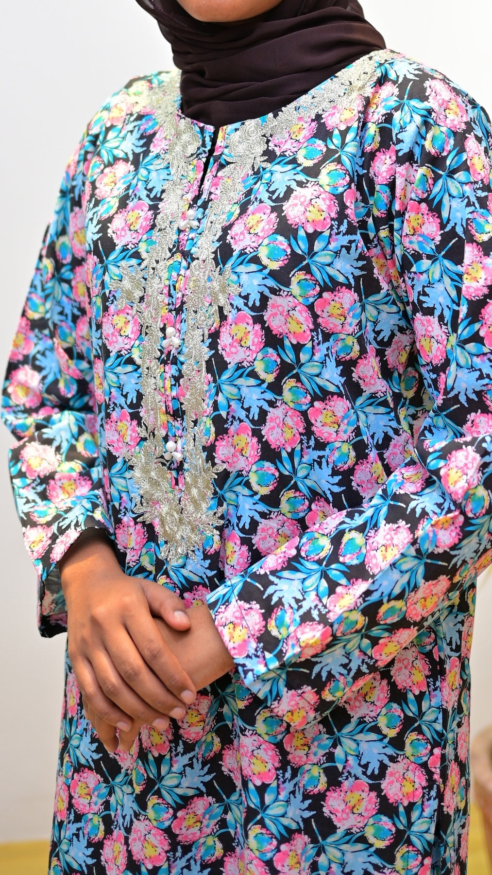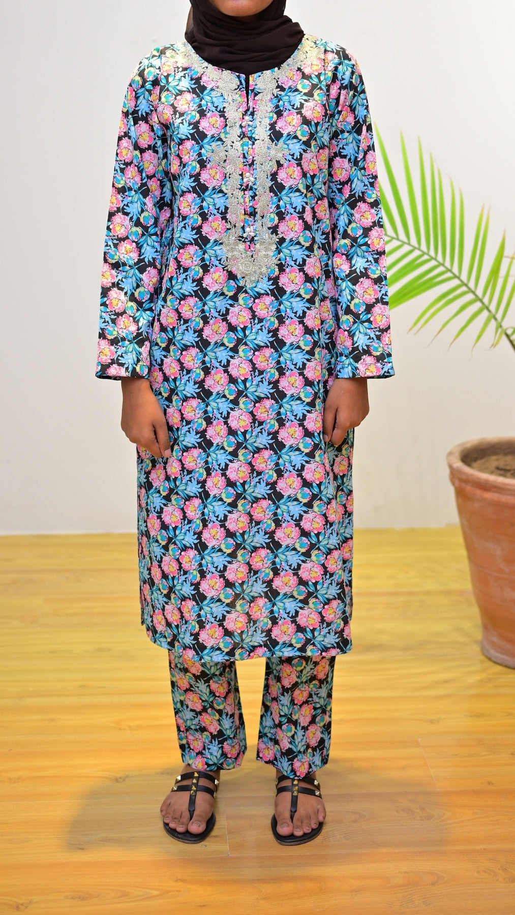 With vibrant rose prints over a black base and silver embroidery at the neckline, Gulaabon Se Sawera brings bold grace to everyday attire — ideal for those who love color with confidence.