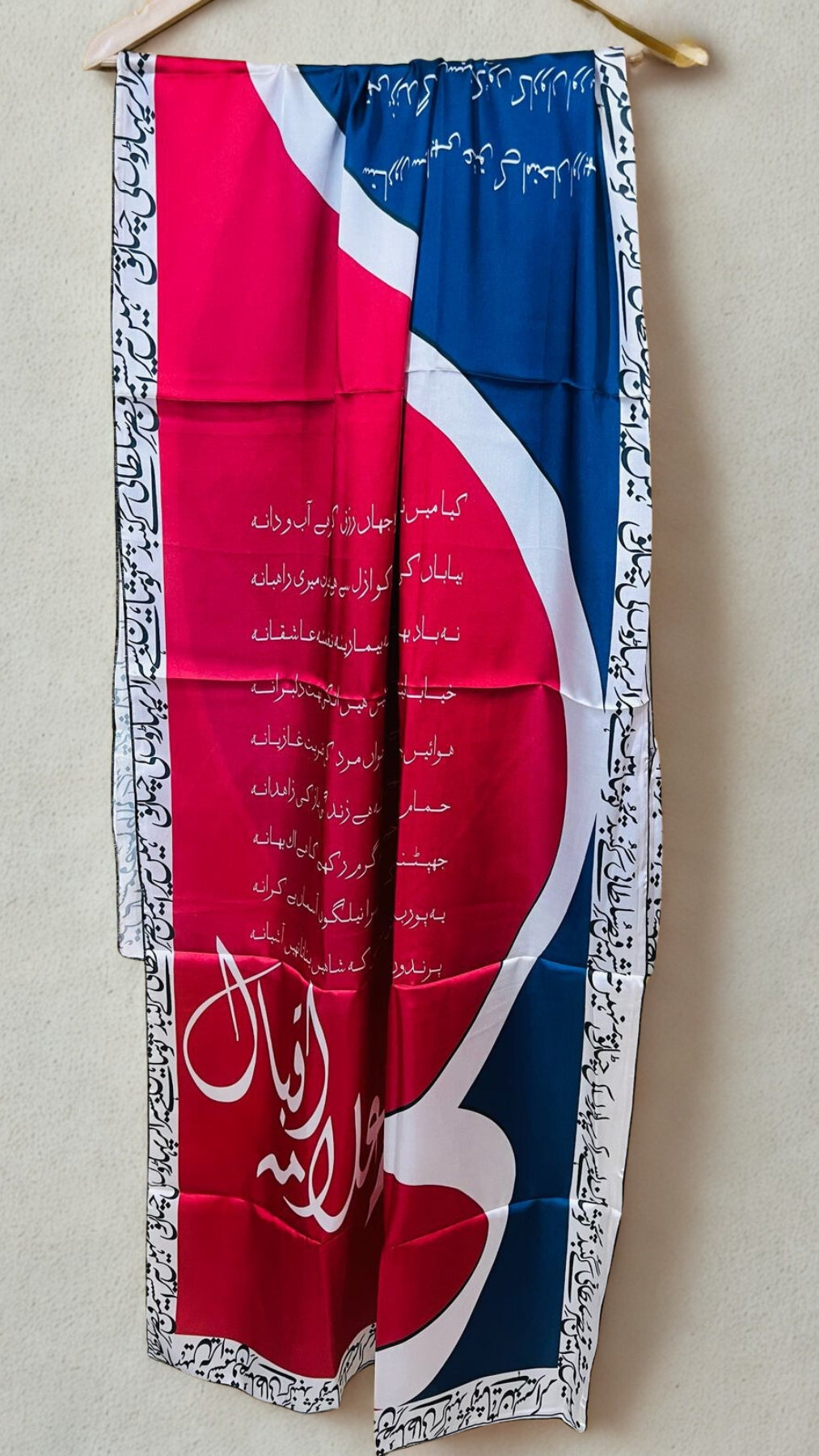 IqbalVerse is a striking tribute to Allama Iqbal’s legacy — designed with bold blocks of red and blue, bordered with poetic Urdu verses. Crafted in soft silk, this scarf is a perfect statement for cultural events, thoughtful gifting, or poetry lovers.