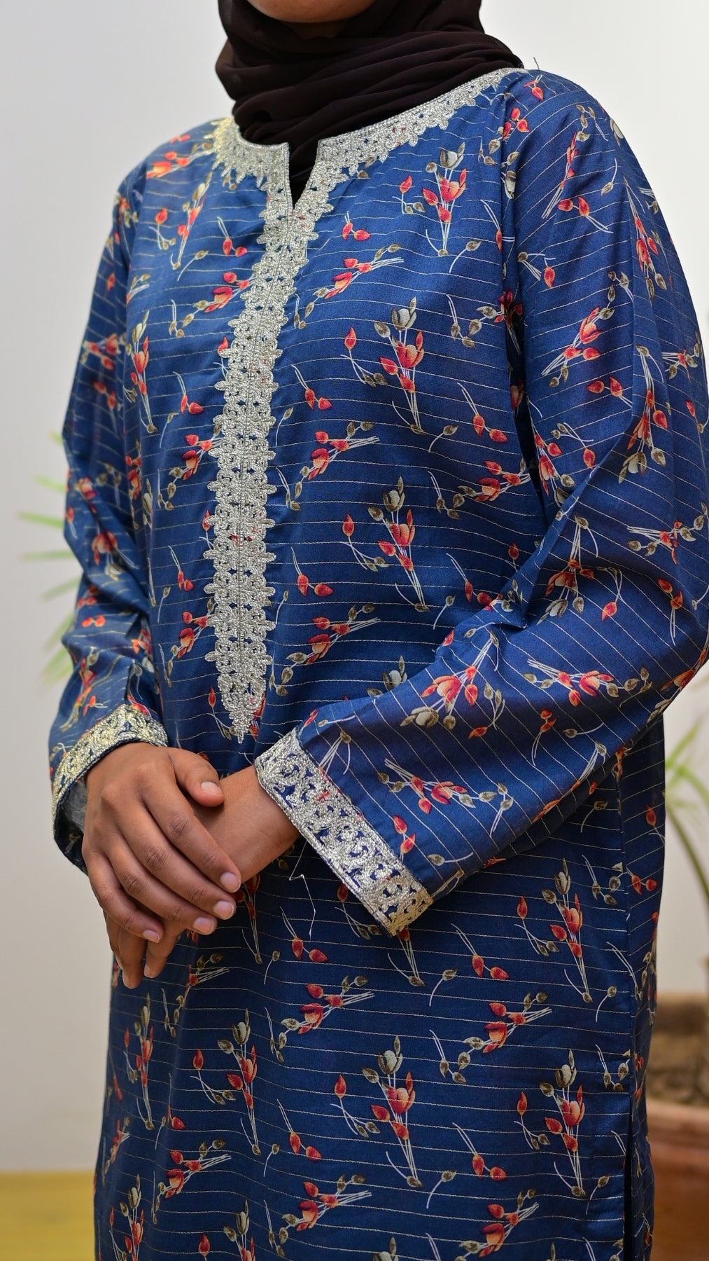 Neelum showcases soft floral prints over a rich blue base, accented with embroidered neckline and sleeves. Effortless charm for everyday style.