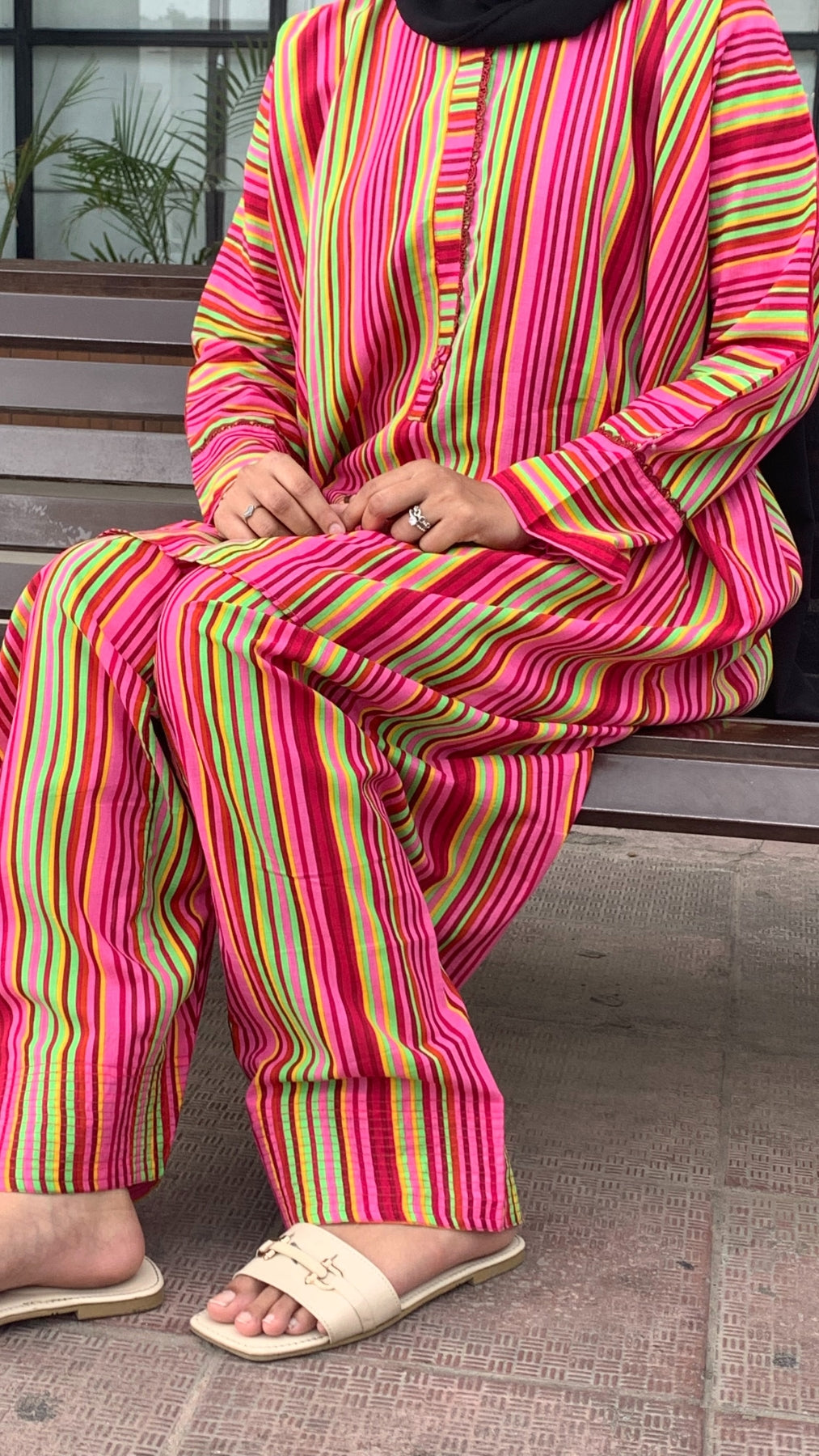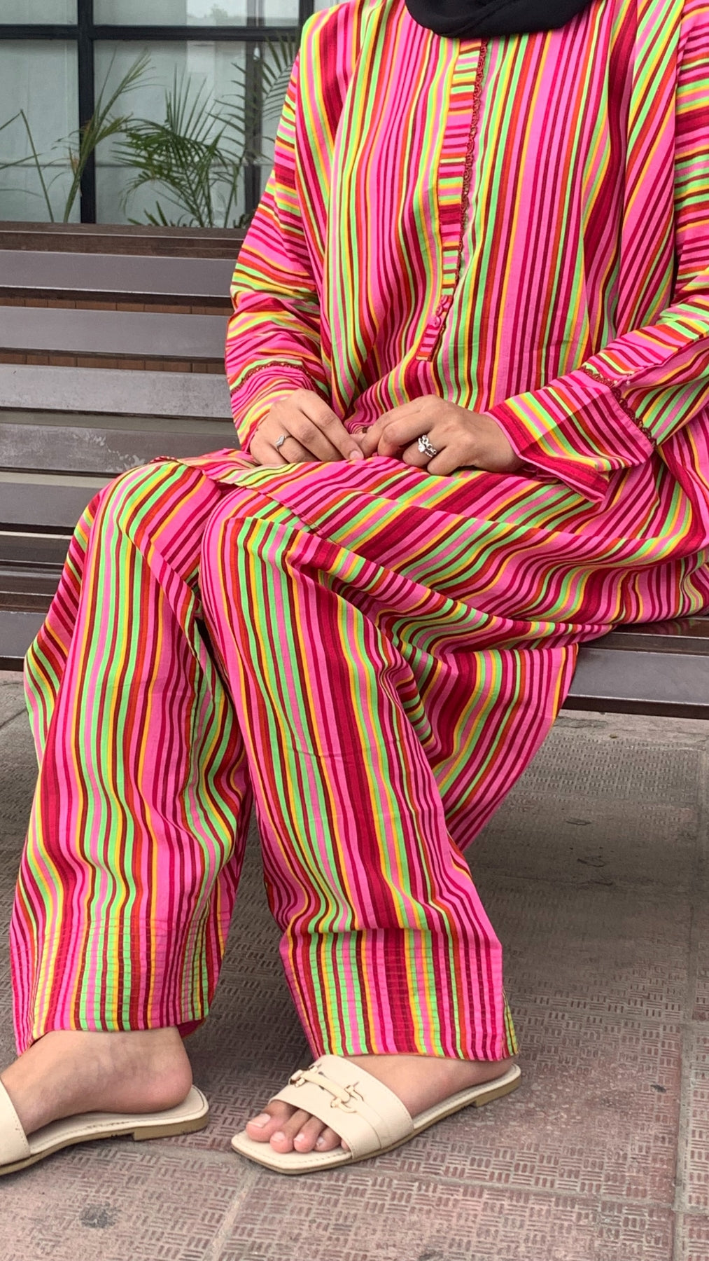 Add a bold burst of color to your wardrobe with Rangeela Classic, a 2-piece striped suit that redefines fun and fashion. Featuring vibrant hues of pink, green, and yellow, this breathable cotton set is your go-to for sunny days, brunch meetups, or casual office wear.