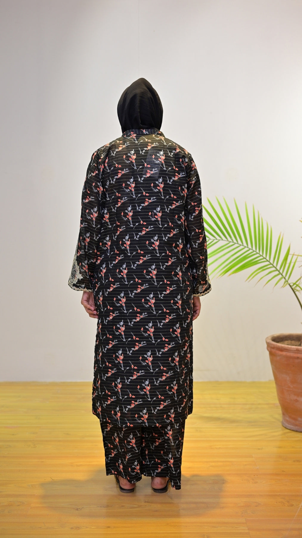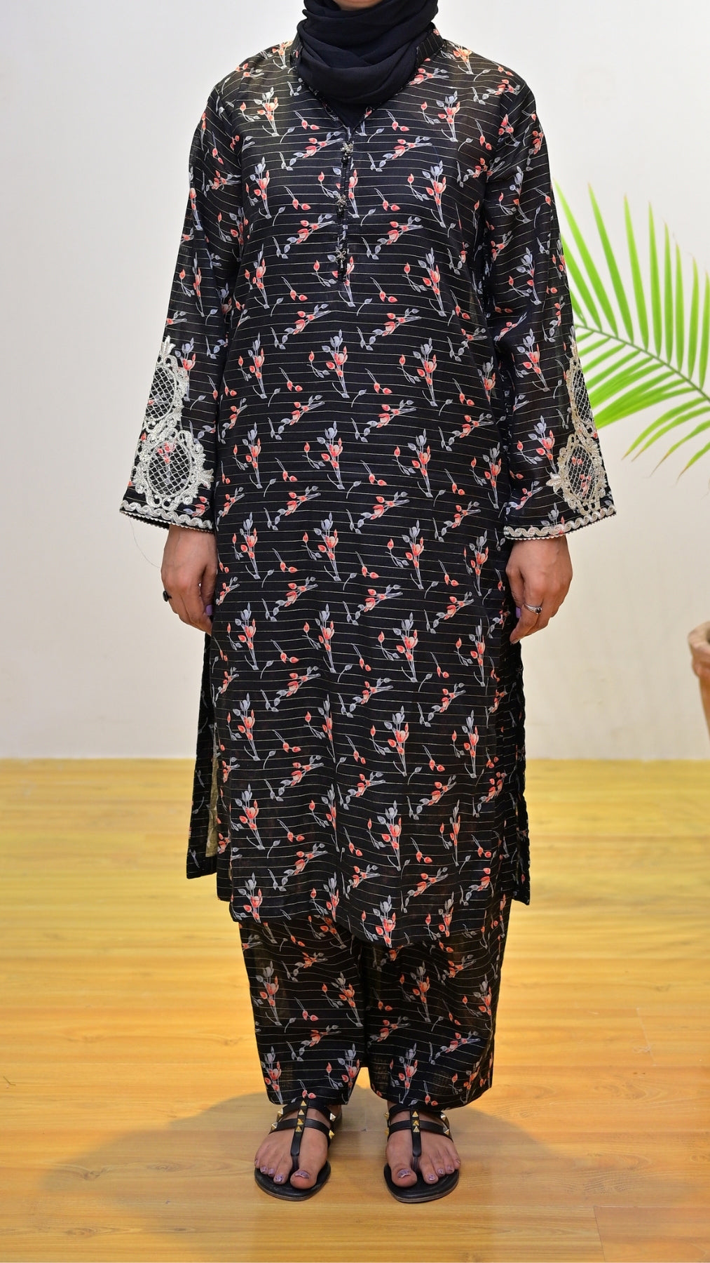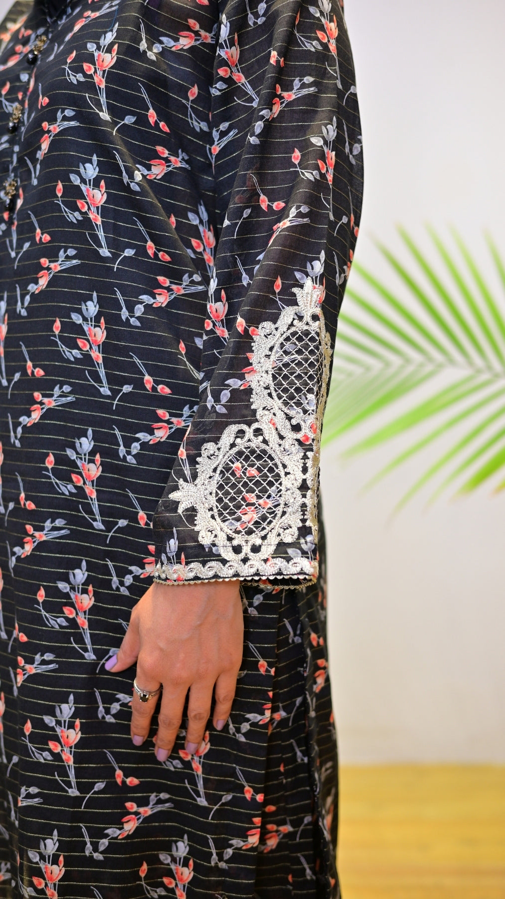 Sunehra blends timeless black with delicate red floral prints, finished with detailed white lace on the sleeves. A statement piece for chic everyday wear.