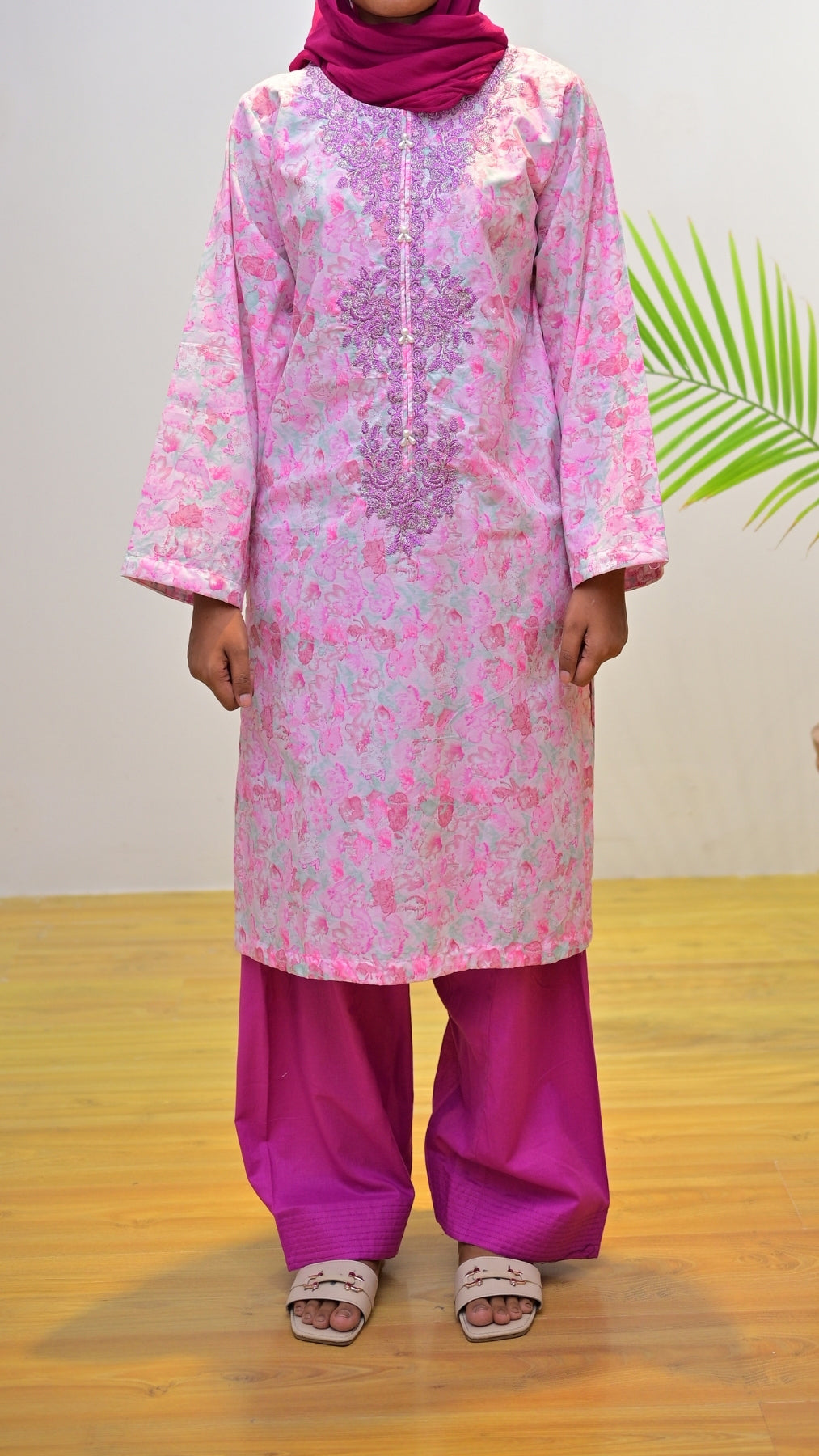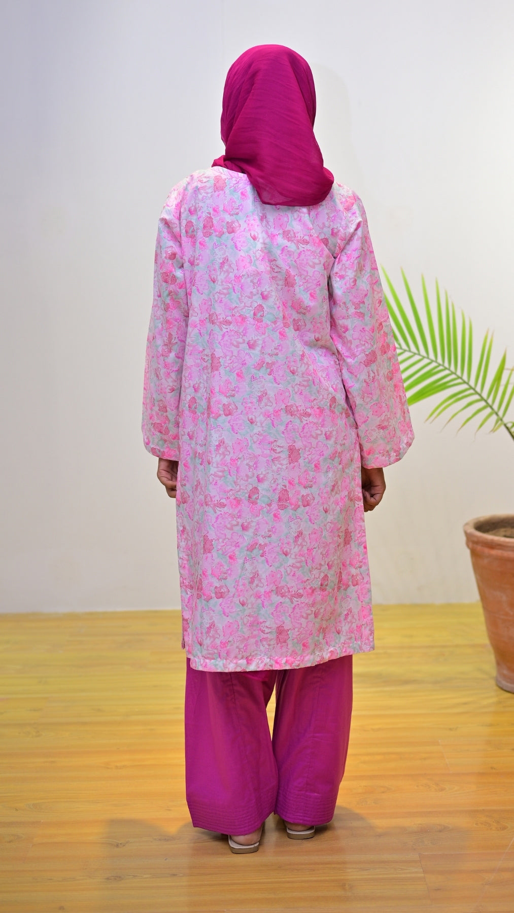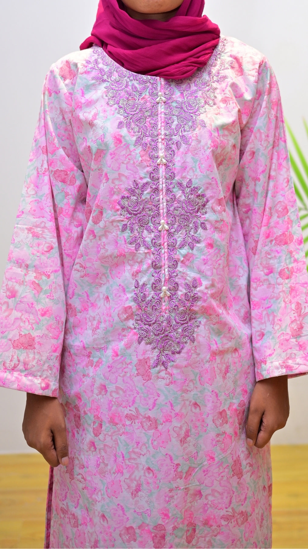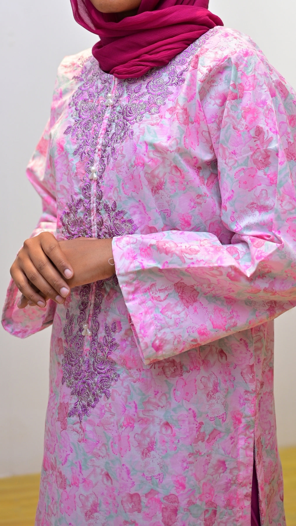 Zureya is a 2-piece pink casual dress with delicate embroidery and a contrast magenta trouser. Soft, stylish, and perfect for daily wear.